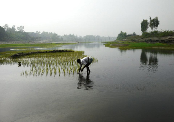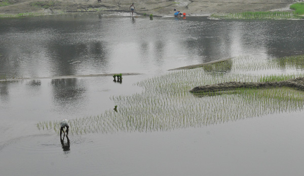 朝食後、少し移動し、橋、川での田植え、畑、市場など一緒にあるエリアへ。